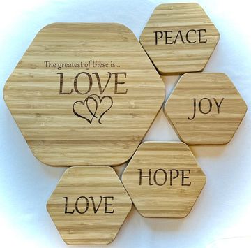 This bamboo set includes 4 coasters and one trivet. The coasters are 5 1/2” wide corner to corner and the trivet is 11” corner to corner. This is sustainably sourced